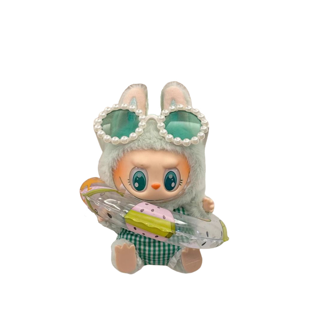 这只绿色的labubu穿着一件同色系的波点泳衣,身上挎着一个游泳圈,头上戴着时尚的珍珠墨镜,整体造型既精致又充满趣味。它那活泼可爱的模样仿佛随时准备跳进泳池,享受清凉的水中时光。无论是夏日派对还是海边度假,这款泳衣都能让你成为焦点,展现独特的俏皮魅力。