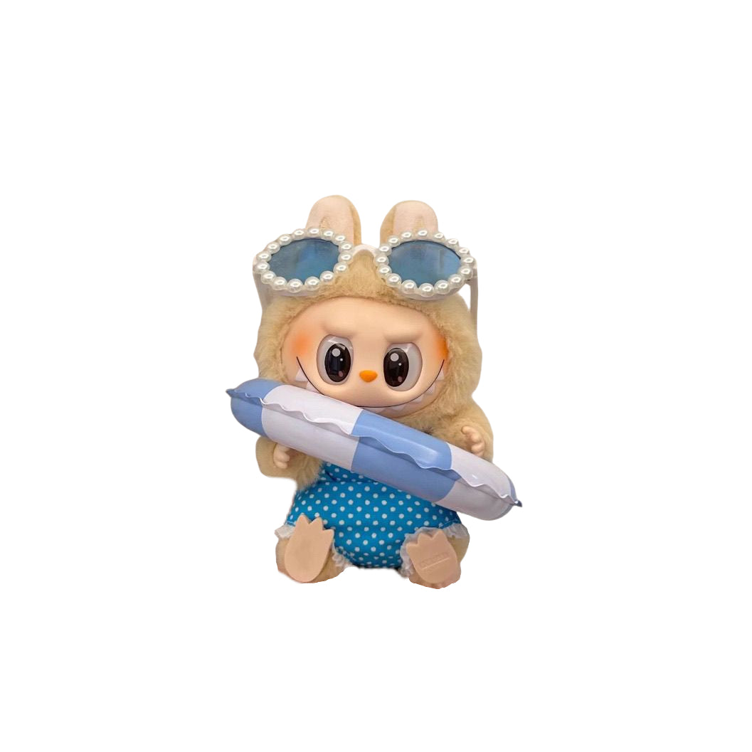 这只迷人的labubu仿佛正准备跳进水里玩耍,它穿着一件蓝色波点泳衣,肩上挂着游泳圈,头上的珍珠镶嵌墨镜更添几分精致与可爱。